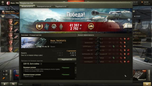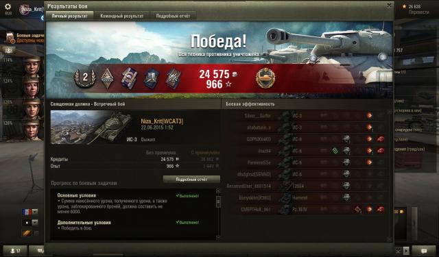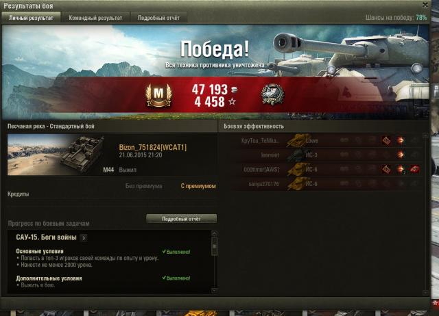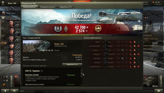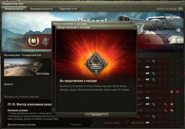 СТ-15 на Об.260: 15"Охота на охотника"Нанести не менее 4000 урона ПТ-САУ противника. Победить в бою.Выжить в бою Девушка-танкист. Наградных листов: 4. 500 000 кредитов Наградных листов: 1. http://wotreplays.ru/site/5733248#self2 балла -