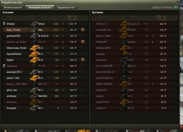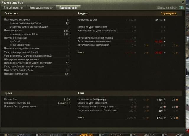 посмотрел реплей. ты сделал слишком много выстрелов в никуда, на Чаффике стрельба не сводясь допустима только на близкой дистанции, если если ты зашёл кому то отвлечённому на союзников и насовываешь в борта или в корму. фугасы на машинах 5+ с орудиями меньше 90мм по мне вообще вредны. и это, дай скриншот из ангара, по моему у тебя с обзором что то не так. PS. у тебя ещё 47 снарядов вместо 48 в БК, дай скриншот1 балл -