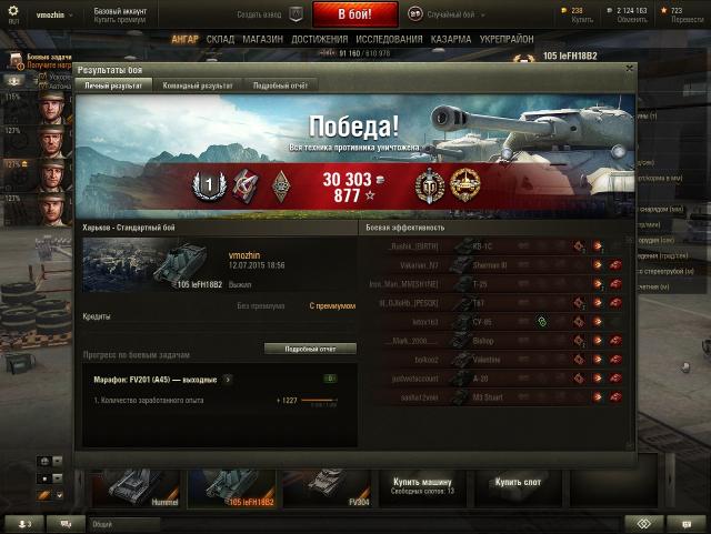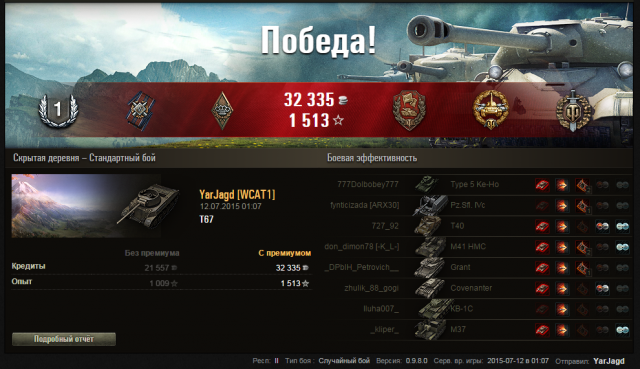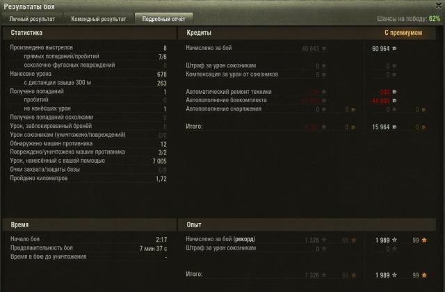 Сыграл два боя подряд на Бульдоге (там время указано). Первый - чуток в конце затупил и не затащил, но мастер при поражении, воин и защитник. http://wotreplays.ru/site/5825574#self Второй - взял первого для себя ПУЛА. 10 фражиков набил. Почет, уважение, в барах угощают бесплатно и все женщины этого мира теперь мои. Ну и еще там куча остальных медалек. Рекорд по опыта на аккаунте поставил - 2983. На открытых картах и в топе Бульдог могет. P.S. Может там есть какой-нибудь конкурс, куда можно запихнуть этот реплей?) http://wotreplays.ru/site/5825565#self1 балл -