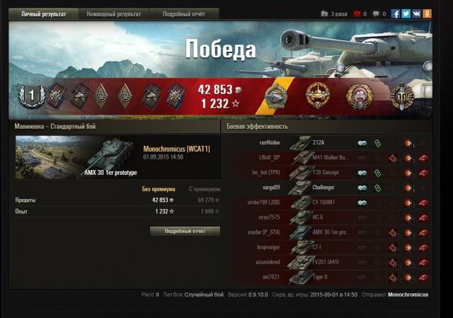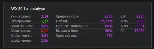 Продолжаем..Вывел 30-ку в элитного..покупать 10 ур не стану..нет смысла Перекинул перки..Теперь с ББ и радиоперехватом+оптика обзор 453 м, а кд 8,35 сек. Как вкачаю орлиный глаз, наверное поставлю вентиль. Очень нравится, что ур только +1...ибо мы 9 . Проблем с десятками нет, голдой за 400 боёв раза 3 пользовался. Танк даже малость в плюсе. Как ББ поставил, так и вертеться стал лучше. В общем-это танк моей мечты. Ну а в свете нынешних событий с патчами- качать больше ничего не буду, донатить не буду. Буду на этом гнуть ( а это он может). Удачи и до встреч. Ну и бонус. http://wotreplays.ru/site/6144835#malinovka-monochromicus-amx_30_1er_prototype2 балла -