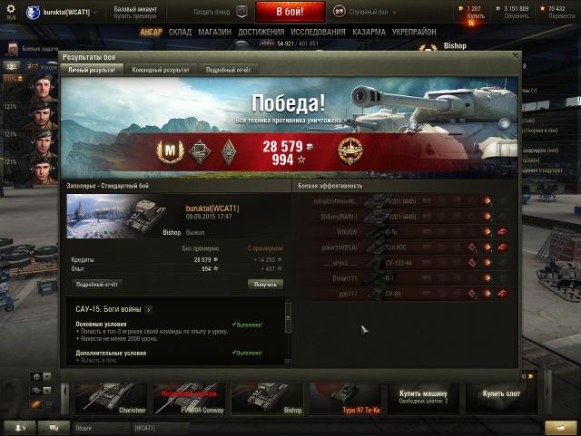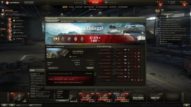 Делал ЛБЗ: убейте на арте 3 танка своего уровня или выше и выиграйте бой. Франки просто тупо не шли. Сливы, "не попал", "накрыл" (а какое там накрыл, с их-то недофугасами!), попадания с Левши в корму Т29, у которого было 136 хп на... 130 хп! И прочая... Вышел в бой на Су-14-1. Даже не ЛБЗ сделать, а х3 сбить... Заряжается долго, сводится долго, зато стреляет как!... Как-как, кверху сами знаете чем... Косо, в общем. Так что это машина раздамаживания: авось сплешем заденет, а не убийства. Но тут попался мне любимый Вестфилд (а он и новый вроде ничего, хотя старый роднее)... В начале боя союзники подсветили на горке Т29, заползавший наверх. Неспеша отхлебнув комиссарские 100 грамм из доп пайка, закусив сальцем из того же доп пайка, экипаж неспешно развернул машину, свёлся и сообщил союзникам об атаке на Т29, после чего послали 203мм фугас в подарок американцу. Результат ниже: Да, пусть Чебурашка был стоковый, пусть всего 1150хп, но все мои После чего в течение боя мне удалось "подсосать" ещё 2 фрага... Су-14-1 это же естественный "подсасыватель" с КД в 49секунд! Кстати, обратите внимание на ГВП в списке. В начале боя состоялся примерно такой разговоро: ГВП врага: О, ТОГ2, еда! Я: ГВП, из какого квадрата стрелять будешь? ГВП: Из такого-то... В итоге ГВП забрал ТОГа, а я забрал ГВП, хотя не по трассеру, а уже засвеченного и повреждённого... Вот за такие, пусть редкие, но всё-таки ваншоты, я и люблю Су-14-1!1 балл -