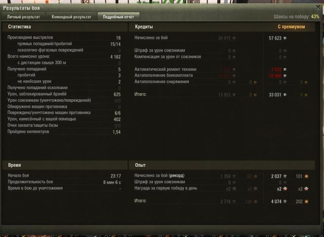На данный момент лучший бой по дамажке http://wotreplays.ru/site/6790237#stats Три звезды никак не даются,повторяется один и тот же сценарий-набиваю 92%,затем серия либо городских боев,либо в компании друзей сливающих бои за пару минут.Всё падает до ~88%,опять набираю свои 92 и снова всё повторяется.Я уже десяток таких кругов нарезал,выхода не видно.1 балл