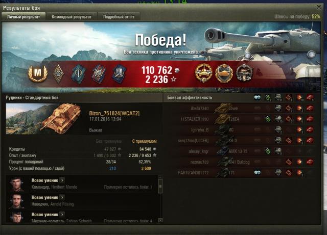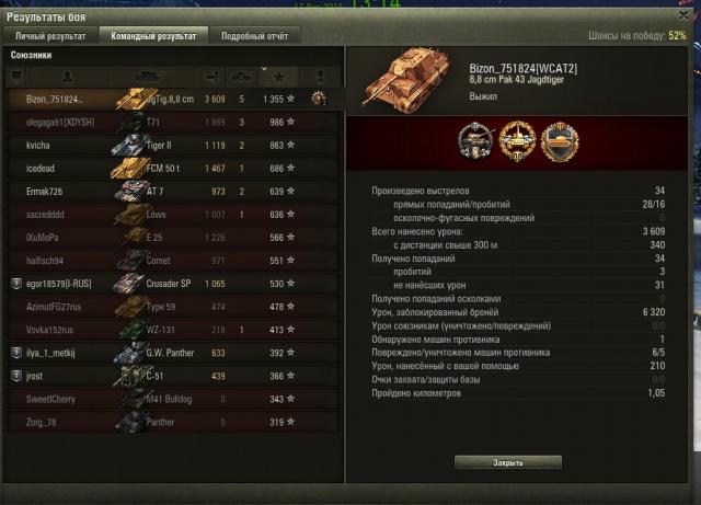 Вот и заканчиваются новогодние акции. Для фарма все эти дни выкатывал Ягу 8.8. Понял, что это имба. Если её кто-то будет прикрывать - это великолепный танк прорыва направления. Если остался один на фланге - это великолепный кемпер, может удержать направление и перестрелять всех атакующих. Держит удар от многих танков, только надо прятать НЛД. Фармит шикарно, успел за НГ акции заработать на два танка 8 лвл, и 5 танков 9 лвл, плюс на оборудование к ним, плюс на шоколадки к каждой нации. Основные противники - фугасострелы: яп.тяжи и арта и тяжелые ПТ-САУ на голде. К арте отношение ухудшилось, в одном из крайних боёв практически вытащил сливной бой, шёл на Колобанова, оставалась одна красная арта, поехал её искать, нашёл, выстрелил, пока был на кд, она развернулась и с вертухи без сведения отправила в ангар. Наверно не стоило говорить, что это было её единственное попадание. Два крайних Мастера За что в этом бою дали Мастера, я так и не понял. http://wotreplays.ru/site/7163831#stepi-bizon_751824-8_8_cm_pak_43_jagdtiger В этом бою 6,3 заблокированного урона. Пока танки противника упарывались на меня, наши раки сумели на остальных направлениях затащить http://wotreplays.ru/site/7163191#rudniki-bizon_751824-8_8_cm_pak_43_jagdtiger2 балла -