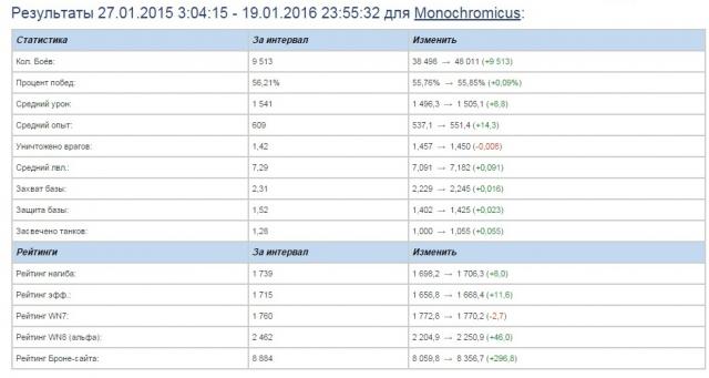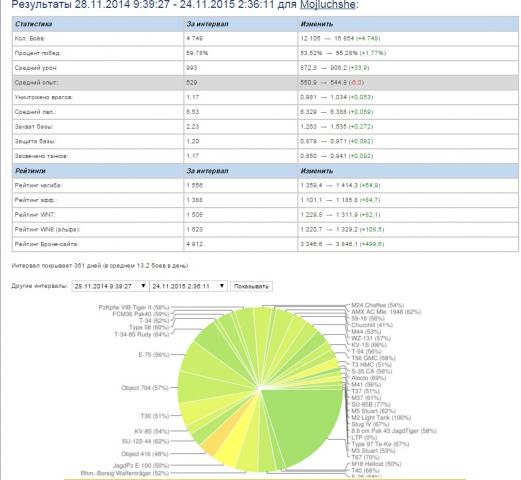 Извините парни, но ваш прогресс по сравнению с моим и рядом не стоял. Так как я, больше в клане "не вырос" никто. Я до сих пор думаю, почему меня взяли? . Я к февралю 2014, т.е. к дате вступления в клан только только начал "понимать Дзен". Смотрю на те показатели и . Фигли - первый и единственный акк. Даже по проценту побед чутка не дотягивал. Если не ошибаюсь, я тогда в оленемере был оранжевым. Сейчас - гордо позеленел . Короче, спс хвостомерке и взводным покатушкам. Результаты 02.02.2014 17:42:26 - 27.10.2015 11:35:55 для _YaGRR_:СтатистикаЗа интервалИзменитьКол. Боёв:7 6205 221 → 12 841 (+7 620)Процент побед:57,24%52,88% → 55,47% (+2,59%)Средний урон:1 118536,9 → 881,8 (+344,9)Средний опыт:612357,6 → 508,3 (+150,7)Уничтожено врагов:1,170,812 → 1,025 (+0,213)Средний лвл.:6,905,301 → 6,229 (+0,928)Захват базы:1,530,921 → 1,285 (+0,364)Защита базы:1,080,690 → 0,918 (+0,229)Засвечено танков:1,631,186 → 1,447 (+0,262)РейтингиЗа интервалИзменитьРейтинг нагиба:1 5441 329,4 → 1 477,2 (+147,8)Рейтинг эфф.:1 415909,7 → 1 216,7 (+306,9)Рейтинг WN7:1 5531 037,3 → 1 370,9 (+333,7)Рейтинг WN8 (альфа):1 7161 013,7 → 1 456,8 (+443,1)Рейтинг Броне-сайта:5 1441 770,8 → 3 698,5 (+1 927,7)Интервал покрывает 632 дней (в среднем 12,1 боев в день)1 балл