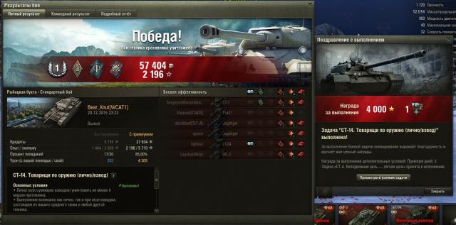 Соло выполнил взводную ЛТ-14 на Т-55А. В принципе сделать это было не сложно на Малиновке-то, но в начале боя вражеский олень-шахид "зашухерил мне всю малину". Я то хотел встать посреди поля в кустах, а этот днарь порашил бортом по центру. Потом еще его коллега упоролся по воде, помешав мне светить из кустов на болоте. Вобщем весь бой только и бегал, ловил плюхи, но своего добился: Реплей: http://wotreplays.ru/site/71760642 балла