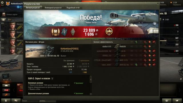 Получил "Мастера" уже на 12 бою, сразу же после того, как поставил топовое орудие (которое топовое же на предыдущей АМХ 105). Бой был просто чудесный: с самого начала дрогнул палец на кнопке мыши и в результате засандалил без сведения прямо по ёлке(пусть и не убил), затем несколько раз подряд проходила альфа, да и точность попаданий неплохая выдалась. В общем, что-то небывалое. Саму арту ещё не понял, пока что похожа на предыдущую, только уровнем выше. Посмотрим. как в топе играться будет.3 балла -
