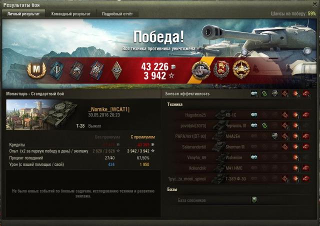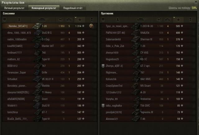 1) динамика. очень сходно с джексоном. Ватновато, разгон тяжелый, маневренность средненькая, но - он таки может набирать свои 60 кмч. Правдо не сразу) и не только с горы - на вестфилде летел 70 - но и в городе на асфальте. в Вайдпарке, с разгона, заскочил на горку жд не потеряв скорости. 2) броня. она как бы есть, но ее как бы нет. 65 мм в самом толстом месте как бы намекает, что непробилы и рикошеты - скорее везение. маска как кажется танкует, но тоже скорее из разряда везения. Та же шкода могла неудачно для себя попасть, не пробив в бою на Мастера. 3, и то с чего стоило начать - орудие. Классическая британская 17фунтовка, стоящая на пт серии ат, Арчере, Ахиллесе, Файфлае. По ттх весьма приемлемая сводка - 2,1, но в бою лучше досводится до конца, т.к. в сочетании с паспортной точностью 0,37 промахи имеют место быть. а также пока не совсем мной понятое распределение снарядов в круге - любим гусли критовать, сводясь по центру танка. ДПМ. Средний на уровне, 4,22 с 100% экипажем и винтом перезарядка. с гусли никто не уйдет) в итоге по орудию, имея 100% экипаж, досыл и винт. стаб на машину не ставиться 0,37 разброс 2 сек сведение 2133 ДПМ. углы: -10/+20. углы иногда решают) Снаряды - маловато. в затяжном бою, стреляя по кд особенно, можно за 4 минуты остатся с пустым бк, но это все таки скорее редкость. апд. из клиента. оказывается, бк у Пипконосца и Ахиллеса равный. на Ахиллесе с пустым не оставался никогда, при меньшем кд. Меня лично машина заинтересовала, будучи виденной на старте одного из боёв у взвода супертостеров, в первую очередь орудием. По стилю игры - это скорее пт,чем ст, имхо. в качестве тренажера экипажей брит-ст - весьма хорош. (не касаясь Кромба - у того ттх и роль в бою иная). В целом я лично покупкой доволен. Помимо камка(но только летнего), к танку прилагаются эмблемки 5 видов.( бонус каждому члену экипажа, пока бонус не введен, 0) Ниочемненький бой на Мастера Если вчера планка Мастера была ниже плинтуса, то уже сегодня, за лежащий в хвостомерке бой - только первая степень. апд. Маскировка сабжа базовая: Маскировка Стоящего танка 13.737 Стоящего танка при выстреле 3.214 Танка в движении 10.317 Танка в движении и стреляя 2.414 для сравнения - Файрфлай базовая: Маскировка Стоящего танка 11.97 Стоящего танка при выстреле 3.112 Танка в движении 8.949 Танка в движении и стреляя 2.3263 балла
