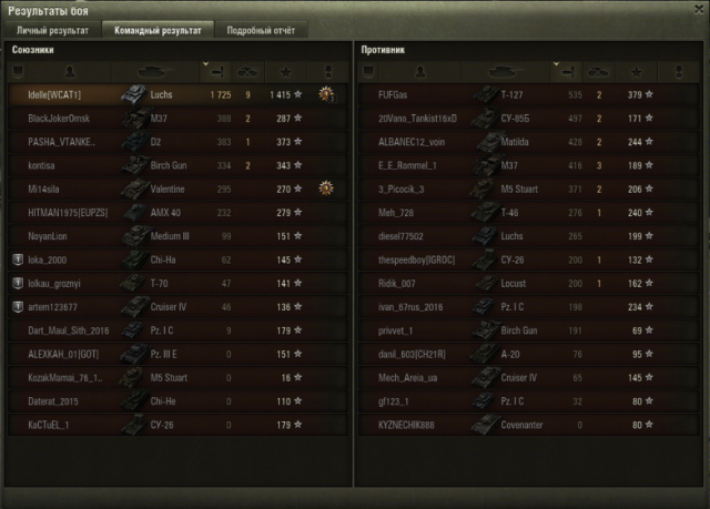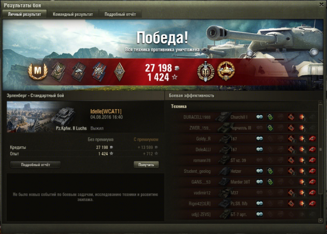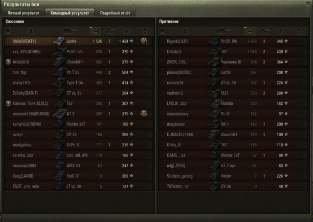 Удивился, не увидев темы про этот танк. Если сделал зря, скажите, удалю. Можно смело сказать - это рако-танк, так как его никто не минует, пробираясь к вожделенным совковым дедам с их фирменными вертуханами. С него начинают все новички в игре. Потому и цветовая гамма встречающихся почти всегда коричнево-красная с количеством боев до 1-2к. Потому это и любимый для пт-водов противник в игре. Выкупил его через 1,5 года после забвения, когда, не видя карты, не слушая подсказок, раковал рандом в поисках вожделенной ТТ-имбы. Это были первые 2-3к боев в этой игре, чистый клиент, ненастроенный комп, разум, незамутненный премудростями танкопробития-дальности обзора-и т.п., вера в справедливость, уверенность, что если тебя убивают, то виноват не ты, а сокомандники, не желающие тебя прикрыть/заслонить. Прошел я его получив всего лишь 3-й класс. И вот он снова у меня. Взял, как понимаете, с желанием набить 3 звезды. Мастер на новой технике, имхо, не так уже приятен, как 3 полоски, хотя познание танка, как теперь понимаю, не заканчивается и с ними. Купил его 5 дней назад, накатал 50 боев со средним 915 и 67% побед, % на отметку подрос с 35% до 85%. Экипаж набрал 3-х перковый, вот только радиста пересадил без перков, в связи с чем ББ не было. (Интересно, а куда девается радист на сов-ТТ 8-9 лвл? Встраивается в командира?) Впечатление одно - он незаслуженно забыт или, правильнее говоря, - сильно недооценен. Конечно, против т67 шансов у него мало, ни обзора (335м - смех) - ни сведения (2,9с - это ужас), но это первый танк, который сносно умеет танковать бортом, это и присутствие фирменных вертуханов от смешной для ТТ пухи (120 пробой, когда играешь против ОИ-ОНИ - это издевательство), это и неплохой показатель КД - 4,22сек с ББ, досылателем, это и неплохая точность, если успел свестись. К недостаткам, кроме пухи, стоит отнести слоупочность. Здесь разрабы вдоволь наиздевались над танком, поворачивается на траве/снегу он чуть быстрее Т-95. Потому игру на нем строил от пт-шной тактики, вперед не лез (всегда есть желающие), его линия игры - 2-я. Угол любого дома - наш лучший союзник в игре, это наш самый преданный и надежный друг! Дополнительное оборудование: на мой взгляд, безальтернативные 2 слота - это досылатель и сведение. А вот что брать третьим (труба-просветленка-вентилятор) зависит от стиля игры. Жесткий трешевый раш - вентилятор, спокойная вдумчивость - рога. Расходники: стандарт, при превышении 90% на звезду, поставлю доп.паек вместо огнетушителя. Ниже скрин получения 2-й отметки, ничего выдающегося в бою не было. Предлагаю делиться своими познаниями танка здесь.4 балла -