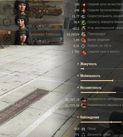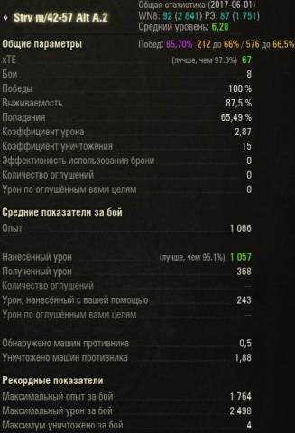 Ну что, продал я недоразумение под названием Fury. И по нескольким причинам, не в последнюю очередь из-за наличия свободно болтающихся шведок и шведов )) В итоге 3 девицы (из-под окна ) - штатно ББ + 1 перк - были посажены в субж ))) Неплохо, должен сказать. С вентилем, бобром и пайком КД в 14,39 сек. Вполне-вполне. Обзор из-за отсутствия наличия радиоперехвата и орёлиц слабоват. С оптикой - 418 метров. Но и не штатные 350 )) Аппарат вполне могёт. Пока я привыкал + слабый экипаж + пару неудачных боёв. Характеристика танка при наличии: Вентиля, бобра, пайка. Маскировка в среднем выкачана на ~96%. Обзор с учётом оптики. Третий слот - приводы на-водки )) К слову, 64% ремки выкачал за 8 (!!!) боёв! Включил резервы на 50% + 200% )) Итого за 8 боёв. 100% побед (спасибо Алану @phaggi - выручил на 2 боя, дальше соло). Ну 100% это вообще из ряда вон Результаты за 8 боёв: Мастер был взят на 3м бою Резюме: ГОДНОТА. Из минусов - углы -6/+10 (по бокам и на корме +12), слабоват пробой, но на голде с премом даже в плюсе ))) Динамика - выше среднего. Если прокачать обзор - то он должен быть в районе 460м в движении. Однозначно не пожалел на такой ТАНК фьюрика ))3 балла -