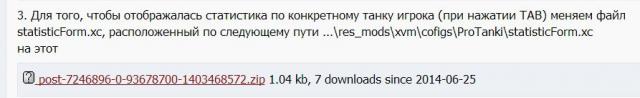 16. Оставлю и тут, может кому в помощь Статистика по каждому танку (0.9.5) Сначала модпак "протанки" (возможно можно на любой мод пак), поверх файл statisticForm, работает. https://yadi.sk/d/gFOmU1rWeA9Wx