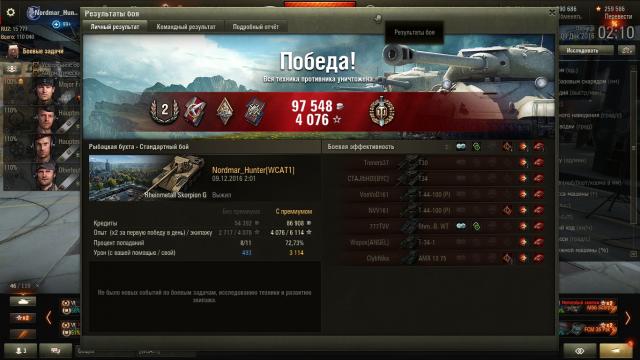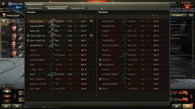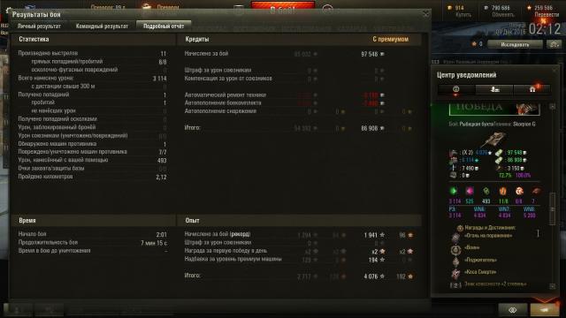 Господа нагибаторы, шо ж вы делаете? Как простым людям, простите, Котам, играть-то и степени зарабатывать?! Мой лучший (надеюсь, пока что!) бой на Скорпионе Гы: 1294 чистого. И это 2 (прописью - ВТОРАЯ!!!) степень?! 4 раза слился подряд на 6 сервере. Озверел, чуть не убил комп, перешёл на 2 сервак. К слову сказать, в настоящее время нахожусь в состоянии алко... празднования Днюхи Клана.... Короче, выбрал Скорпа: сольюсь пятый бой подряд, так хоть пофармлю. В начале боя всё шло как обычно: союзные ЛТ светили путём слива, наш фланг давили. И я начал стрелять... Зло, почти не соображая... Через короткий момент времени увидел, что у меня 4 фрага, фланг мы отстояли, а счёт уже сравнялся! В итоге попёр дальше, к "косе" заработал воина за 7 фрагов, в промежутке не попав в арту фугасом (тяжёлый оказался, рухнул не долетев!)... Блин, самому приятно. Белиар с ними, мядальками, но бой мне понравился. Уж насколько предыдущие 4 боя у меня ничего не летело, а тут попёрло... Вот и не верь после этого в смену сервера... Фотожшоп: Видеомонтаж: http://wotreplays.ru/site/9311035#stats