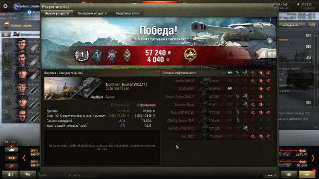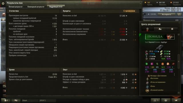 На "хвостомерку" не тянет, но пострелял славно, причём часто даже и не светился (вот что три хлопчика с Ягера-1 делают с маскировкой! хе-хе... ): Фотошоп: Очень ситуационная и картозависимая машина. Если свезло с картой/сетапом, то можно чудеса творить, главное никуда не спешить... Но в ряде случаев хочется сразу из боя выйти... А, эта, видеомонтаж: http://wotreplays.ru/site/9928245#stats