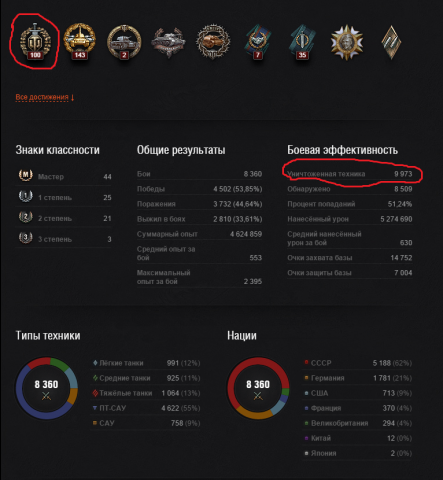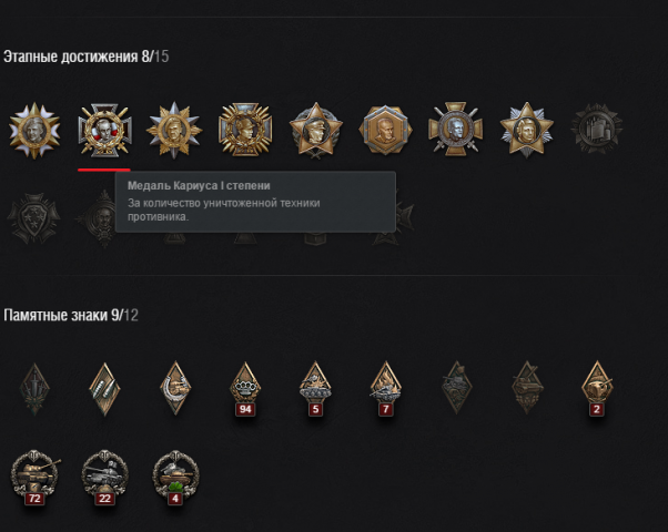 Выкладывал уже реплей юбилейного (хоть и скромного по кошачьим меркам) сотого воина, вот он в профиле: И обратите внимание на количество уничтоженной техники: немного не дотягивает до 10 тысяч тушек! Но при этом вчера в крайнем бою получил медаль Кариуса первой степени. В профиле не отображается, но в игре точно помню, писалось, что даётся первая степень за 10К убитых...