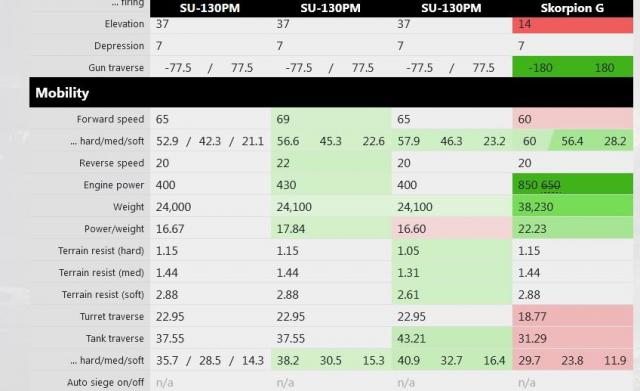 Самое интересное, что Скорп имеет такую же хреновую проходимость. Прям один в один, на всех грунтах. Но у него и максималка выше, а уж удельная вообще почти на треть выше 22,23 против 16,67лс/т у голых машин. Теоретические выкладки, кстати, подтверждают твои эксперименты. С турбиной лучше, чем без неё, но с зацепами вместо турбины ещё круче выходит. Если честно, не ожидал этого! https://tanks.gg/compare/su-130pm?t=su-130pm___-1.S.-1~su-130pm___-1.P.-1~skorpion-g Или вот картинкой. Первая Сушка без никто, вторая с турбой, третья с грунтозацепами. Как контрольная группа - Скорп без никто. Заметьте, грунтозацепы дают даже чуть больше прибавку к скорости, чем турбина. И хотя удельная мощность ниже, набор скорости, скорее всего, будет идти лучше из-за меньшей сопротивляемости грунтов. И обратите внимание, насколько растёт скорость поворота! С 37,55гр/сек до 43,21! Этот чуть позже гляну. В предыдущих двух реплеях у тебя два варианта оборудки. У тебя два альтернативных стоит или ты просто эксперементируешь и пока не решил, на чём остановиться? Я вожу 2 варианта: трофейный малошум-стаб-боновая оптика трофейный малошум-КОП (слот на разведку)-боновая оптика. С одной стороны, Бураск очень годный ЛТ и сборку на свет я пользую регулярно. С другой, средний урон (именно урон) у меня еле 1100 превышает, что мало для такой тачанки. Я, конечно, много светом добираю, но всё равно топчусь на уровне 57-59% суммарного и никак даже первую отметку не возьму. Поэтому думаю, что и как поменять. Малошум можно сменить на трофейные УМП (у Бураска почти как у Фритюра, управляемость утюга на скорости). Можно боновый вентиль, есть в запасе (целых два!). Я смотрю, у тебя боновый стаб стоит. Но по идее, у Бураска стабилизация и так годная. Коэффициент разброса 0,10 от всего (что бы ни значила эта цифра, но это очень и очень мало, т.е. хорошо!). Ну по стабилизации башни бывает лучше, а вот при повороте корпуса и в движении 0,10 это просто великолепно. А вот конечная точность у Бура просто ужас, 0,40 голой машины с 100% экипажем. При обычном стабилизаторе 0,08, при боновом 0,07. ИМХО, именно на Бураске вообще не стоит своих 200 бонов на снятие! Трофейный, к слову, чисто по цифра в танкс.гг вообще не даёт отличий от простого стабилизатора. В общем, пора делать тему для сравнения цифирь и личного опыта по оборудке на разных танках.