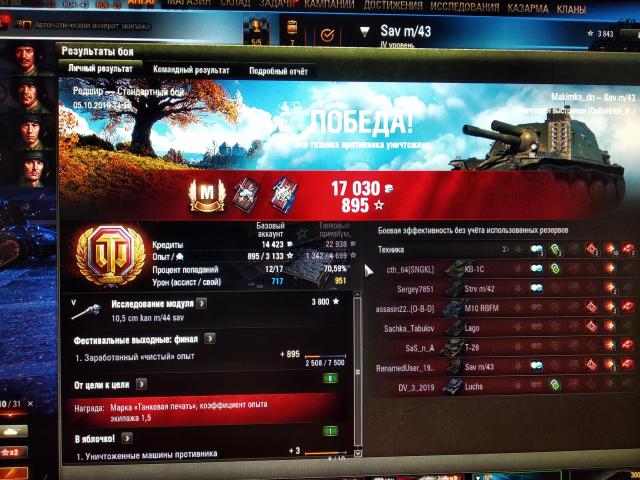 Блииин) осталось 15тыс опыта, скорее бы уже. Косость просто жесть. С 46 метров не попал в бок су100. Но на 400 залетело в хэлката. Один раз отличился - на полном ходу в арту попал с 50 метров)) вот это был номер.)