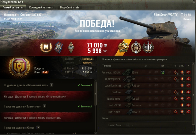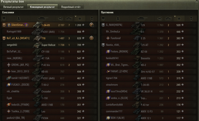 25й (юбилейный))) танк с 3*** к СУ-100, СУ-122-44, M18 Hellcat, M10 Wolverine, ELC AMX, T-34-85 Rudy, StuG-III-G, СУ-100м1, СУ-152, Т67, Т-34, S35-CA, Объект 416, Т25 АТ, WZ-131G FT, ЛТГ, СУ-85И, Т-34-85М, Т-34-2G FT и Udes 14 Alt 5, Super Hellcat, T20, Challenger и T-34-1 (по мере завоевания) добавляется Ikv 65 Alt II (Швеция, ПТ, 6 ур) Уверенно шёл к 95 бою с 92% отметок... и как отрезало... 6 или даже 7 сливных боёв подряд с никаким результатом... и пошли качели, кое-как вытянул. Огромное спасибо Андрею @ KoT_u3_KJIaHa_KoToB и сыну @ Geo_Chirurgo , с которыми мы тащили взводами!