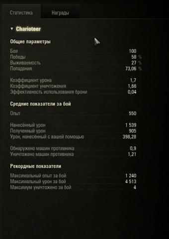 Откатал 100 боёв, можно подвести промежуточные результаты. Трудно даётся эта машина, отсюда и такие средние результаты (всего лишь 1 класс и даже нет отметки на стволе). Играл соло.Экипаж 1,8 перка. В основном тактика такая: играю со второй линии, в конце боя, по обстановке, можно и рейды в тыл совершить (в начале боя рашить боюсь ). Машина несомненно имеет ряд достоинств и преимуществ, но хочу остановиться на минусах. 1. Плохая стабилизация орудия (перки: "плавный поворот и ход" очень будут кстати) 2. Отвратительные для пт УВН. (не раз подводили в бою) 3. ПТ не то что картонная, скорее она хрустальная. (бьют все). 4. Ни в коем случае не идите на таран: малая масса танка, 30+тн, не способствует этому. (мой таран с бат чатом чуть не стал для меня летальным) Хочу остановиться на голд. фугасах. Очень эффективны против светляков, картонных французов, да и вообще против 6лвл. Мало того, что урон фугасом при пробитии намного выше, так еще и калечим соперника по полной. При пробитии проходит 3-5 крита, особенно это фатально для светляков, даже если и выживут, то пользы уже от них ноль.