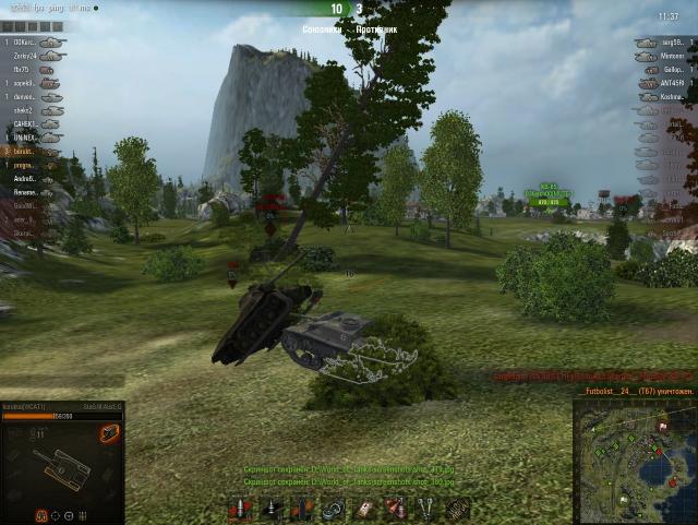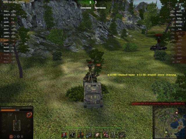 2 тарана за 8 секунд и взвод из 2-х т67 в ангаре! Мы на штуге можем всё, что угодно, и не только из кустов стрелять. Сюжет таков: врываемся на позицию пт, и вот тут наступает момент истины: два ствола против одного! 486хп против 350! два т67 против 1 штуга! Кажется, что расклад сил не в нашу пользу, но фактор внезапности на нашей стороне! И так, бьём первого т67 в борт, снимаем 162!хп (максималка прошла), оставшиеся 45хп добираем тараном. Со вторым по той же схеме: выстрелом снимаем 132хп, оставшиеся 147хп забираем тараном!!!! Я был не уверен, что именно тараном снял 147хп (за выстрел часто проходит и того меньше) Но в замедленном просмотре видно. что танк уже уничтожен, а круг сведения ещё зелёный. Значит пт была уничтожена именно тараном, а стрелял я уже в труп. Удар был такой силы, что я думал т67 залетит ко мне на крышу http://wotreplays.ru/site/4609014#tihiy_bereg-buruktal-stug_iii_ausf_g - 11-46