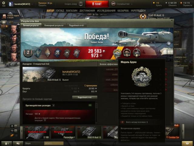 Затащил в "химках" если бы не союзная арта, оставшаяся в живых, был бы Колобанов. Бой динамичный и интересный. ВБР был на моей стороне, как сказали бы наши "критики" - никакого скила, одно сплошное везение. http://wotreplays.ru/site/3931154#zimniy_himmel_sdorf-buruktal-stug_iii_ausf_g