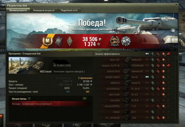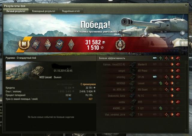 24. О бедном Locustе замолвлю я слово: танк мне подарил добрый ВГ при регистрации нового акка и неожиданно подарочек очень понравился, довольно много плюсов обнаружилось в процессе научения: маленький, быстрый, глазастый, довольно таки точный, очень хорош для фарма. Но и минусов предостаточно: неповоротливый, картонный, слабое пробитие, ну и, конечно, отсутствие льготного уровня боев. Тем не менее, очень уж мне полюбился этот малыш, чуть поболе даже, чем т127. Играю с новеньким экипажем, только докачиваю второй перк, оборудование для активного света: вентиль, рога, оптика. Перки: лампа командиру, маскировка остальным, ББ - 97%, скоро заработает (переобучила по акции, знаю, что надо было дождаться 100%, но жалко голду тратить). ЗЫ. Мастер берется гораздо легче, чем на т127 почему-то...