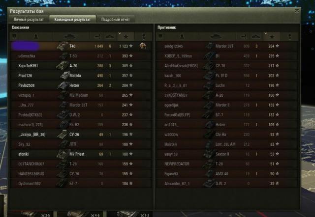 23. Спасибо, чаще всего в поражении гораздо больше дамага и фрагов получается, потому как поневоле приходится воевать за всех, а так жадные союзники сметают все и всех)). Единственный случай, когда при большом количестве выживших союзников удалось много настрелять - это странный бой, за который меня наградили голдой, непонятно почему команда совсем не играла...Я потом глянула на результат и глазам не поверила.