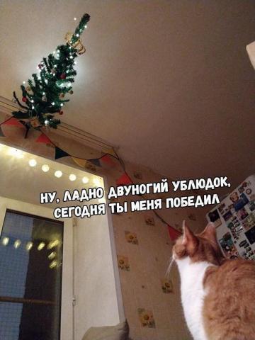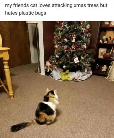 7. Кот моего друга любит атаковать рождественскую ёлку, но ненавидит полиэтиленовые пакеты