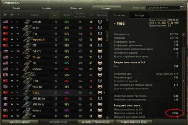 Позавчера зелёный игрок во вражеской команде на Т-50-2 на карте Фёдор настрелял в бою с шестёрками 3350 хп, а ещё и насветил. Взял Воина, ОК и Паскуччи.