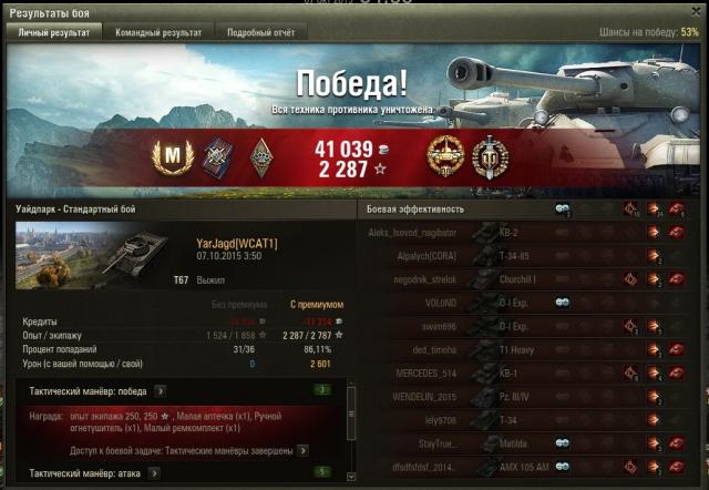 Победа со счёта 3-7, дамажка 2600, всё получалось и моглось Защитника ещё бы, но "неберунги" съехали, добивать Дикера поехали. http://wotreplays.ru/site/6426556#vaydpark-yarjagd-t67