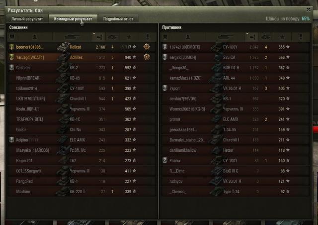 Хороший взводный бой. 10 фрагов на взвод, остались вдвоём против 6 и выиграли. Допустил ошибку и получил ненужную плюху от Арла, хорошо, что Виталя его забрал. Остался шотный и повезло - рикошет от ёлки (слава ВБР ) Без лампы тяжело, догадывался, что засветился, но уйти от Сашки не успел. Ну а Виталя, чётко закончил процесс затаскивания итог чат реплей http://wotreplays.ru/site/4406190?secret=ac9fab797b85b46923c12beb51de34cc реплей от Витали/Бумера Был бы один - не затащил бы. Вывод: Играйте взводами и всё будет ХОРОШО!!!!