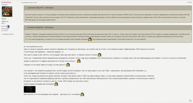 Sevaev, йес, сэр! Вчерашний бой: http://wotreplays.ru/site/5096488?secret=b2f29175864a1b49f10e6ad26e40e464 Ванька-ЧИХ расстроился, когда мы проигнорили его новую тактику и не поехали с ним на горку Хотя он оттуда тоже пострелял нормально В реплее: 1. Тактическое решение с занятием нубо-куста на Е1 при игре с нижней базы. 2. ПРАВИЛЬНОЕ занятие позиции в нубокусте. Обратите внимание как олени с воодушевлением по нему палили пытаясь выцепить там меня, еще больше демаскируясь при этом С верхнего респа стоять тоже там же 3. Пострелюшки в конце с целью нафармить еще опыта и для повышения среднего дамага.