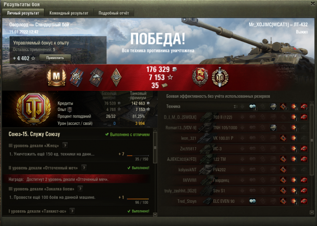 И так, спешу похвастаться долгожданным Мастером на ЛТ-432. Долго я к нему подбирался, 5-6К насвета не давали желаемого результата, максимум 1 степень, а иногда и вторая.... Но как оказалось, для мастера я смотрел не в ту сторону. На этой машине стоит реализовывать ДПМ, что принесло свои плоды. Бой вышел не слишком тащерским, но и не особо скучным. Рандом решил поджечь вражескую Танюху ближе к концу боя и не дал взять Редлика. В очередной раз убедился что на этой машине просто необходим мастер тарана (ближе к концу боя об меня разбился Гвардеец и подарил мне воина), а главный секрет успеха на этой технике - твой совзводный должен перевернуться на другом фланге в начале боя
