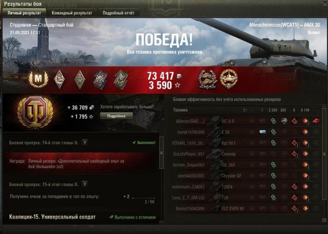 15. Мастер на недооцененном рандомом танке и Коалиция-15 с отличием http://wotreplays.ru/site/13735628#studzyanki-monochromicus-amx_30_1er_prototype Перед этим боем ещё один Мастер http://wotreplays.ru/site/13735629#lasvill-monochromicus-amx_30_1er_prototype