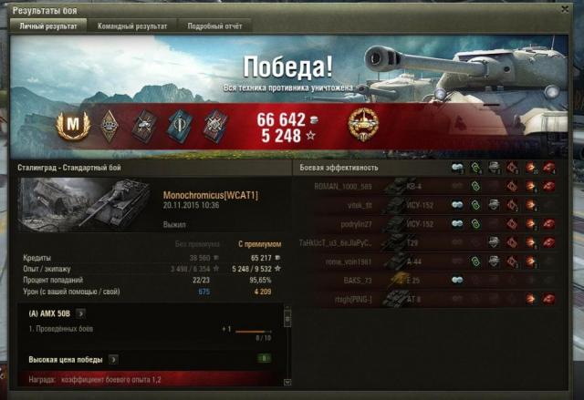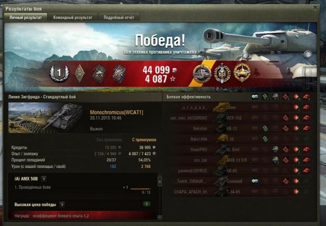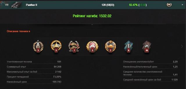 Ну вот и пройден очередной танк. Почти все модули достались с других веток, так что танк я получил практически в топе. Да и девичий экипаж был неплох, даром, что командир-блондинка. Набор снаряжения: аптечка+ремкомплект+голдовый огнетушитель. Досылатель+труба+вентиль. КД 6,16 секунды. Пушка довольно точная. Играл практически на ББ, даже и не помню, когда голдой пулял. Очень понравился таран. При такой массе и неплохой броне удавалось приятно удивить противников. Машинка несколько ватная, хотя и с неплохой максималкой. но резвой назвать никак нельзя. Броня вроде должна быть, но по факту пробивают везде. Из критов- достали частые криты БК, особенно его критуют при выстрелах в борт в районе лба башни. Игра как правило строилась от обзора, играл на дистанции. Но в ближнем бою любимый приём-поймать противника на гуслю и не отпускать до полного уничтожения. В целом-ощущения позитивные, но оставлять в ангаре не стал, ибо люблю машинки побыстрее и с большей альфой. Благодаря сумасшедшей акции на день артиллерии, смог в один день набить 60к опыта. Всего потребовалось 128 боёв. http://wotreplays.ru/site/6662804#stalingrad-monochromicus-panther_ii http://wotreplays.ru/site/6662830#l_zigfrida-monochromicus-panther_ii