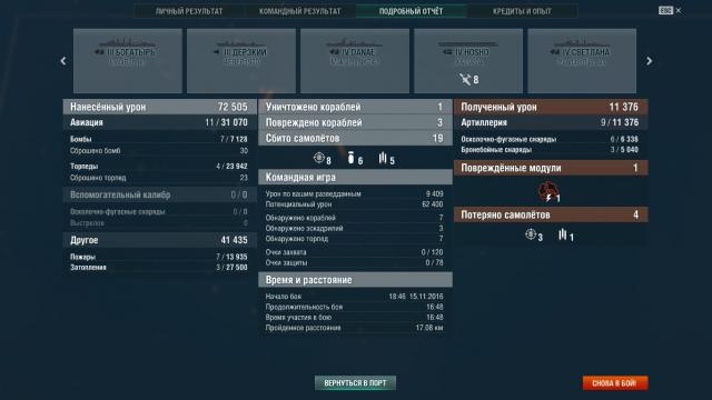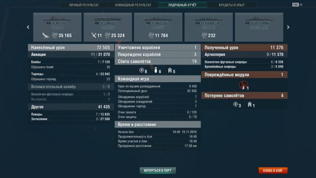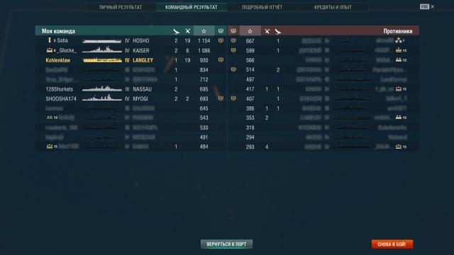 Итак, из-за задания начал качать Лэнгли, и это мой первый опыт в авиках. Сыграл 7 боёв, и команды попадались из клоунов каких-то, постоянно открывали огромный коридор, через который свободно проходили эсминцы и крейсера, и вернуться прикрыть попробовали всего один раз, и то нифига не успели. И ведь не сказать, чтобы днища, за 8 боёв 63% побед вышло, просто, видать, пофиг на свои авики. А вот на восьмой бой команда попалась вменяемая, и зацените, какая разительная разница получилась между результатами за этот бой и прежними 1-9к урона и 7 сбитыми. То, что после боя лайкать нельзя, оказалось неприятным сюрпризом. Хотел лайкнуть один линкор, который и атаку сдержать помог, и прикрыл меня от прорвавшегося крейсера.
