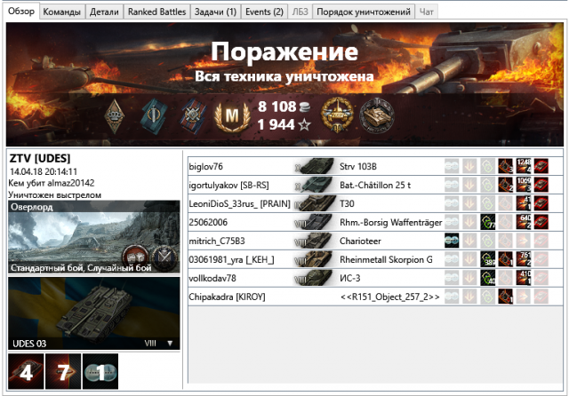 Два Мастера с подсадки. Мне просто стало по человечески жалко соперника на 103B Я его просто в щи разобрал с подсадки на Оверлоде Ну и второй бой с той же подсадки 5677 ДМГ просто в ЩИ не переставая 20180414_2014_sweden-S21_UDES_03_101_dday.wotreplay 20180414_2134_sweden-S21_UDES_03_101_dday.wotreplay