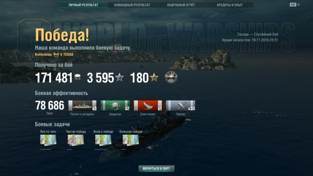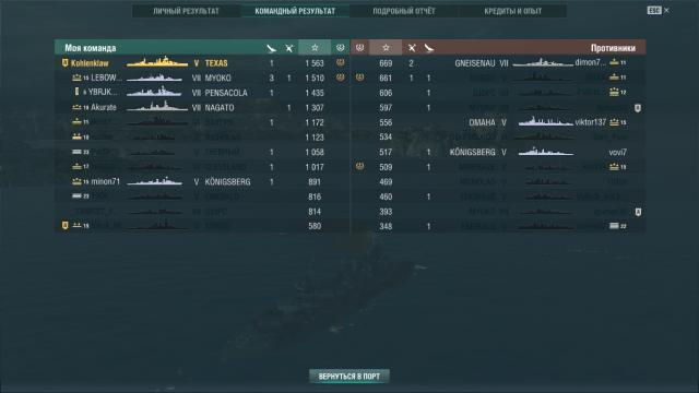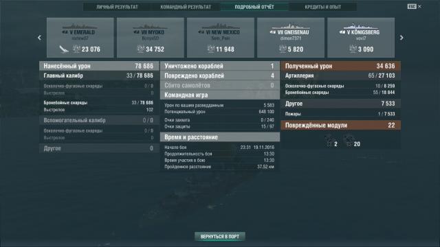А вот результаты первого на нём боя - несмотря на то, что попал к семёркам, получилось вполне достойно, даже жаль, что очки так быстро вышли (честно говоря, что мне не нравится в геймплее корабликов, так это их тиканье). И, да, это божественное ощущение двойного попадания в цитадель, мм!