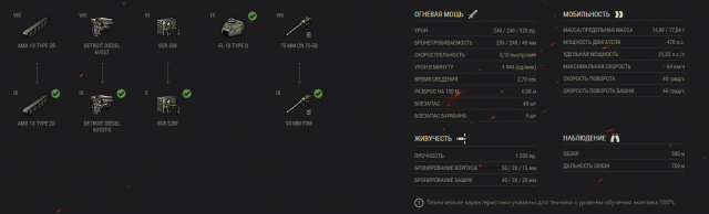 Ребаланс наступил. Что же мы получили в итоге? «Светляк с зубами» AMX 13 90 переместился на IX уровень и получил прибавку к мобильности и огневой мощи. Теперь его снаряды обладают базовой бронепробиваемостью 205 мм, вместо 6 снарядов в барабане осталось 4, но и перезарядка стала меньше почти в 2 раза. Достоинства: высокая максимальная скорость; отличная динамика; лучшая незаметность среди всех ЛТ 9; барабан на 960 единиц урона; низкий силуэт, обеспечивающий отличную маскировку. Недостатки: посредственная точность, плохая стабилизация, долгое сведение; худший обзор среди всех ЛТ 9; малые углы вертикальной наводки; уязвимость к поджогам и к повреждениям модулей, особенно боеукладки и башни. Орудие стало более комфортным, можно спокойно играть на основных снарядах, и перезарядка по сравнению со старыми ттх довольно быстрая.