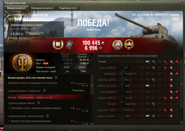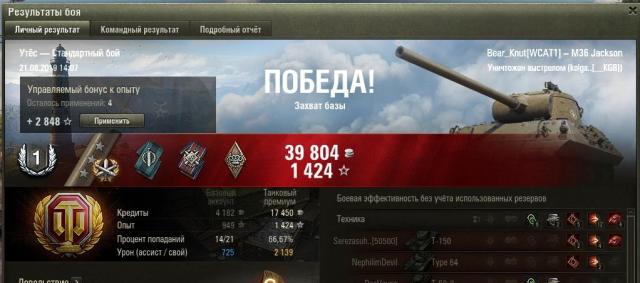 aleksey_trb Опубликовано 14 февраля, 2014 Жалоба Опубликовано 14 февраля, 2014 Вчера таки открыл его , и купил . Долго думал - его брать , или Хэла , но аргументов за Хэла так и не услышал . Машина понравилась даже на стоке , сток-гусли и башня со сток-пушкой позволяют поставить обвес ( сразу поставил досылатель - на перспективу ) . Едет машинка нормально , динамика годная . Стреляет тоже нормально , но топ-пушку открыть надо побыстрее . Хотя у меня пока ещё льготные бои идут , но надеюсь набить 14к побыстрее .Мне в теме ИСУ-152 аргументированно обосновали, что льготных боёв кроме как 1-е 20 на 1-ом уровне нет. Хотя казалось, что первые 3 боя всегда балансит хорошо. Джексона открыл ещё с СТ, но что-то смущает его редкость. Да и его отличие от Халкета не особо радует, броня лучше, но для 6-го уровня её почти нет, зато скорость и динамика хуже. Цитата