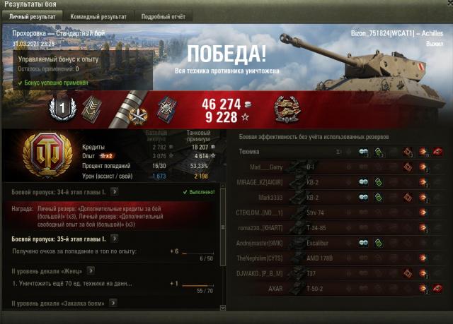 SilentSmart Опубликовано 18 декабря, 2014 Жалоба Опубликовано 18 декабря, 2014 (изменено) M10 Achilles Немного изображений Ахилеса: ТТХ: Подробная таблица ТТХ (не финальная, некоторые пар-ры уже изменены на тесте): Бронирование: Корпус - 38/19/19 Башня - сток: 57/25/25 / топ: 57/25/25 Прочность: 610..640 Скорость поворота шасси - 32..34 градусов/сек.Скорость поворота башни - 14..16 градусов/сек. Максимальная скорость +48..-13 км/ч Углы вертикального наведения +20..-5° Мощность двигателя – 410..500л.с.Масса – 28,29 т.Удельная мощность – 17,67 л.с./т. Дальность обзора – 330..360 мДальность связи – 400..550м Экипаж: 5 человек (вангую: командир, мехвод, наводчик, радист и заряжающий) Вооружение: [table]Ур.ОрудиеПробиваемость (мм)Урон (хп)Скорострель. (выстр/мин)Разброс (м/100м)Время сведенияУрон в минV3-inch AT Gun M7101/117/38110/110/17518,750,332,52062,5VIQF 17-pdr AT Gun Mk.V143/171/38150/150/19012,240,352,31875VIIQF 17-pdr AT Gun Mk.VII171/239/38150/150/19013,040,361,91956[/table] Схема бронирования: Комментарии: Ахиллес – еще одна машина, которой британский тюнинг пошел на пользу. И дело не только в замене орудия, и довеске хитпоинтов (что к стати сделало Ахилла третьим по просности, после АТ8 и Churchill GC), машина заметно порезвела, причем на столько, что английский М10 мотается быстрее английского Шермана. На мой взляд, именно на этой машине 17-ти фунтовая пушка раскрывается в полной мере: параметры сведения и скорострельности лучше только у пт-7, но при этом мы имеем максимально комфортный диапазон уровней боев. В целом из британской конверсии М10 получилась очень и очень неплохая тп 6-го уровня, что-то среднее между Jackson’ом и Hellcat’ом. Я взял и подсчитал обзор: Возьмём с топ башней, обзор в базе: 360м с оптикой без всего: 396 с трубой без всего: 450 с бобром: 367 с пайком: 375 с бобром и пайком: 383 со всеми ништяками и оптикой: 421 со всеми ништяками и трубой: 478 со всеми ништяками, трубой, с орлом и радиоперехватом: 508 Далее, я подсчитал перезаряд топового орудия: альфа 150 в базе перезаряд: 4,6 сек, дпм = 1956 с досылателем: 4,14 сек, дпм = 2173 с досыл. + бобром: 4,04 сек, дпм = 2227 с досыл. + бобром + пайком: 3,93, дпм = 2290 PS. Описание буду дополнять. Танк мне очень понравился, буду однозначно брать Изменено 18 декабря, 2014 пользователем SilentSmart Nordmar_Hunter, YAR_bear_ и zzzyuk 3 Цитата